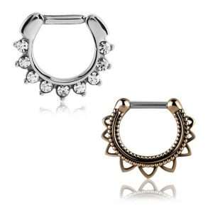 Gioiello specifico per i piercing al naso, posizionato nella divisione cartilaginea tra le narici, permette di applicare una grande varietà di gioielli decorativi, da semplici ferri di cavallo a clicker ornati con gemme. I nostri gioielli septum sono disponibili in diverse dimensioni di gauge e diametri, per garantire una perfetta adattabilità a ogni anatomia nasale.