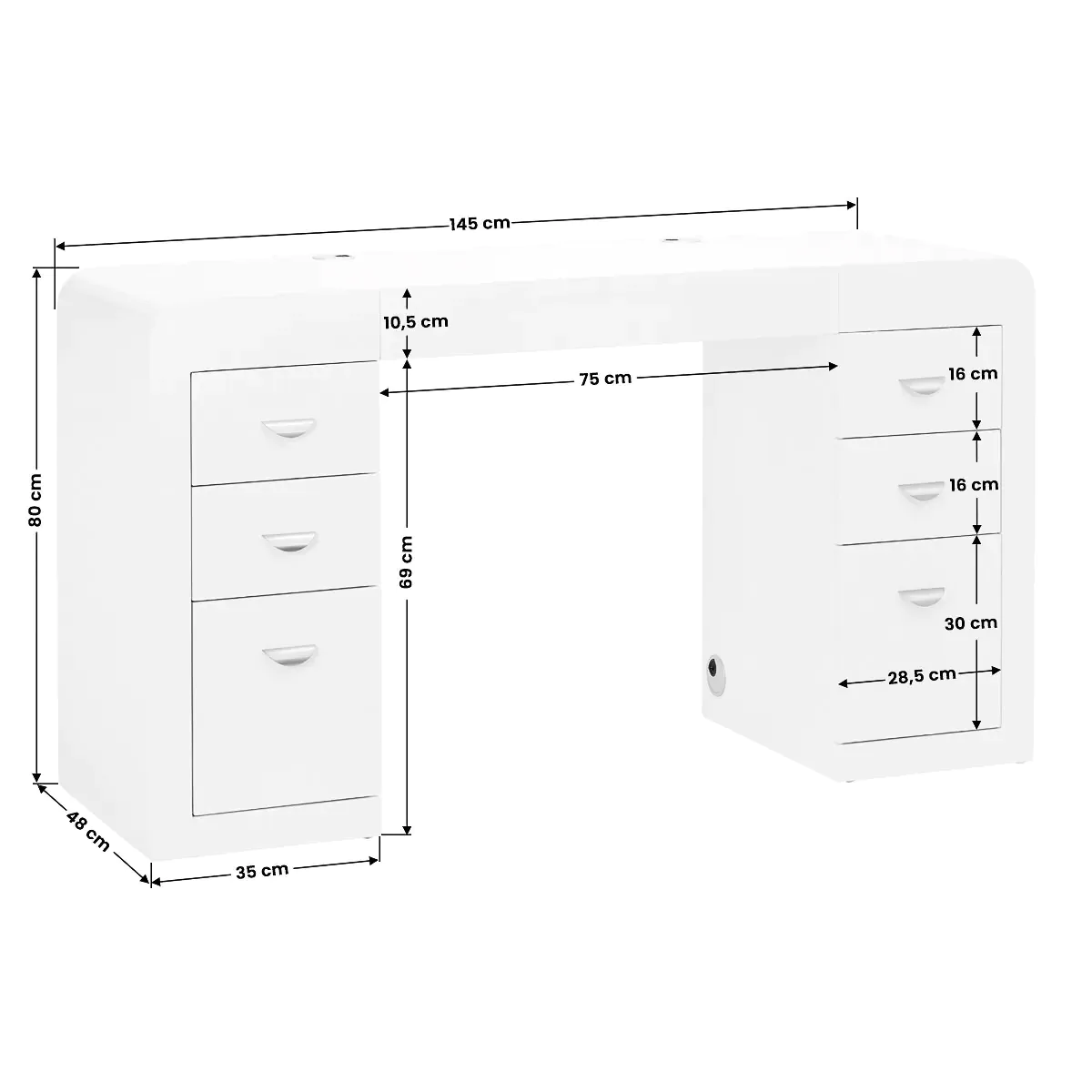 - Gli armadietti su entrambi i lati, dotati di tre ampi cassetti, facilitano notevolmente l’organizzazione e la conservazione dei cosmetici e degli utensili più essenziali. Ciò garantisce che i prodotti essenziali siano sempre a portata di mano, contribuendo ad aumentare l’efficienza lavorativa . La scrivania è dotata di appositi fori sul piano per il passaggio dei cavi dei dispositivi essenziali, consentendo una facile manutenzione di una postazione di lavoro ordinata ed esteticamente gradevole .